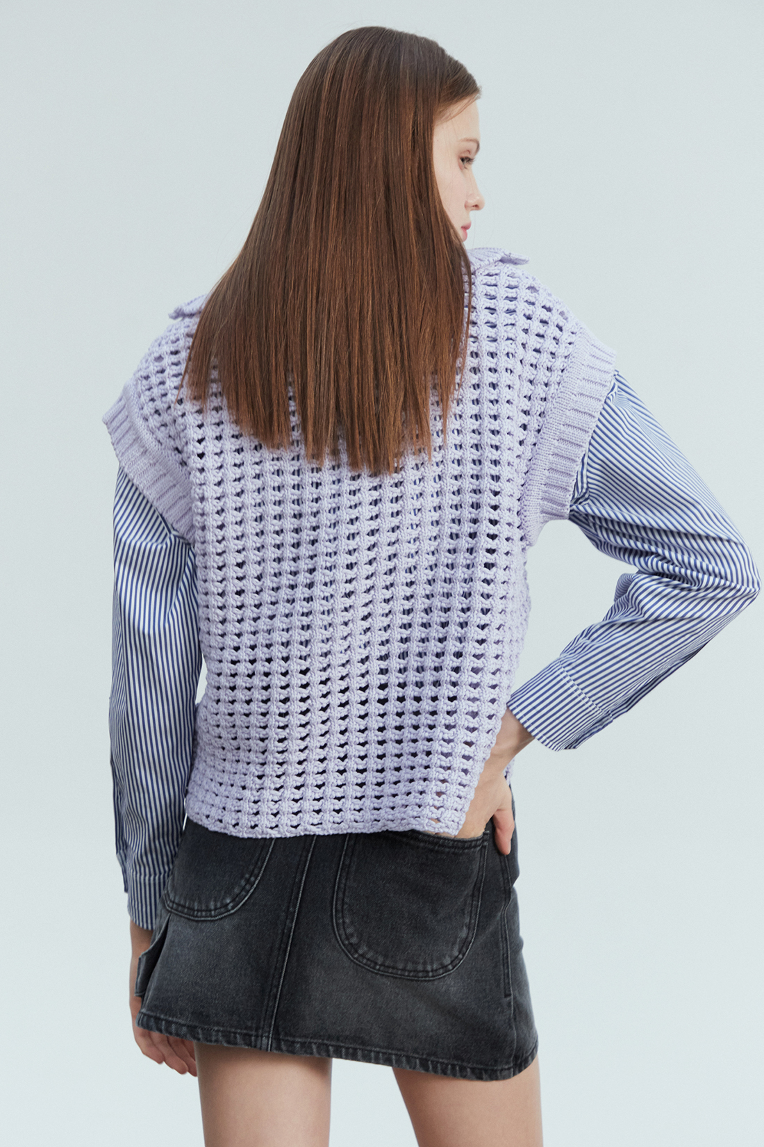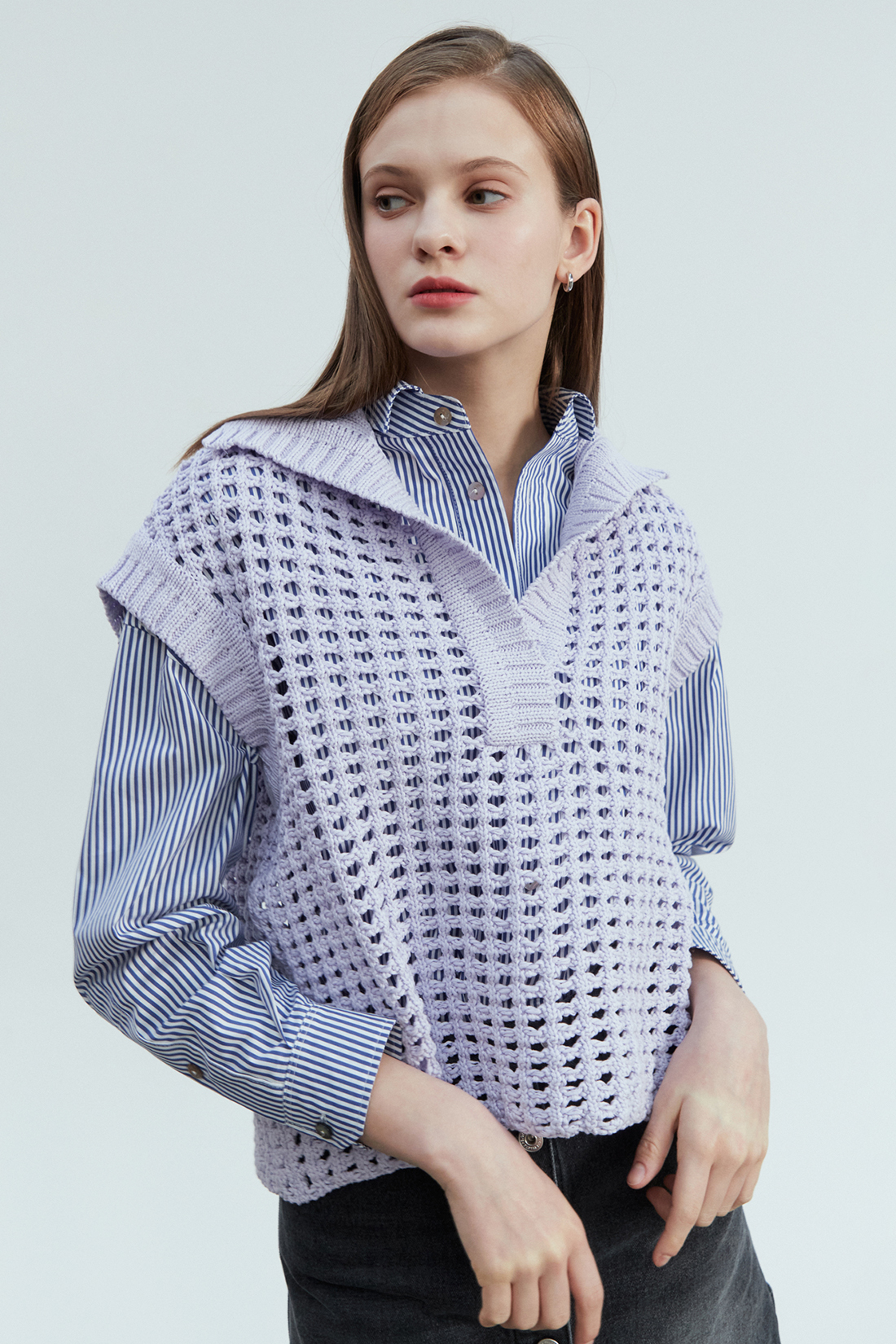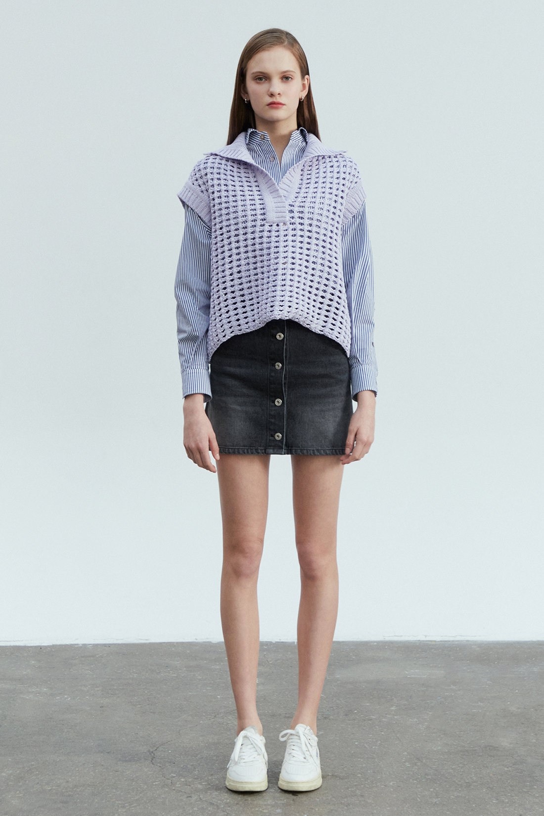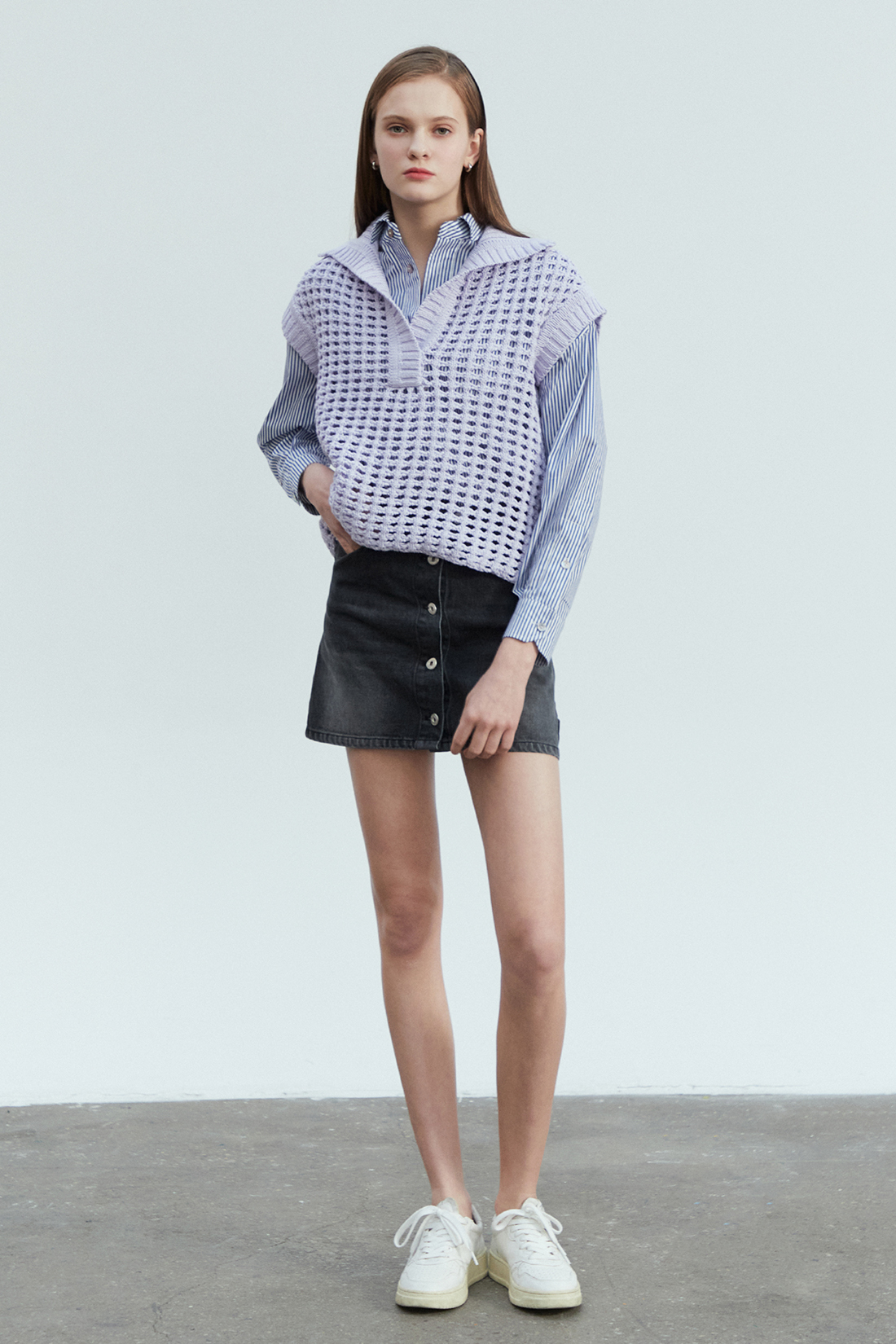 네트망을 연상하게 되는 카라넥 니트 베스트입니다.