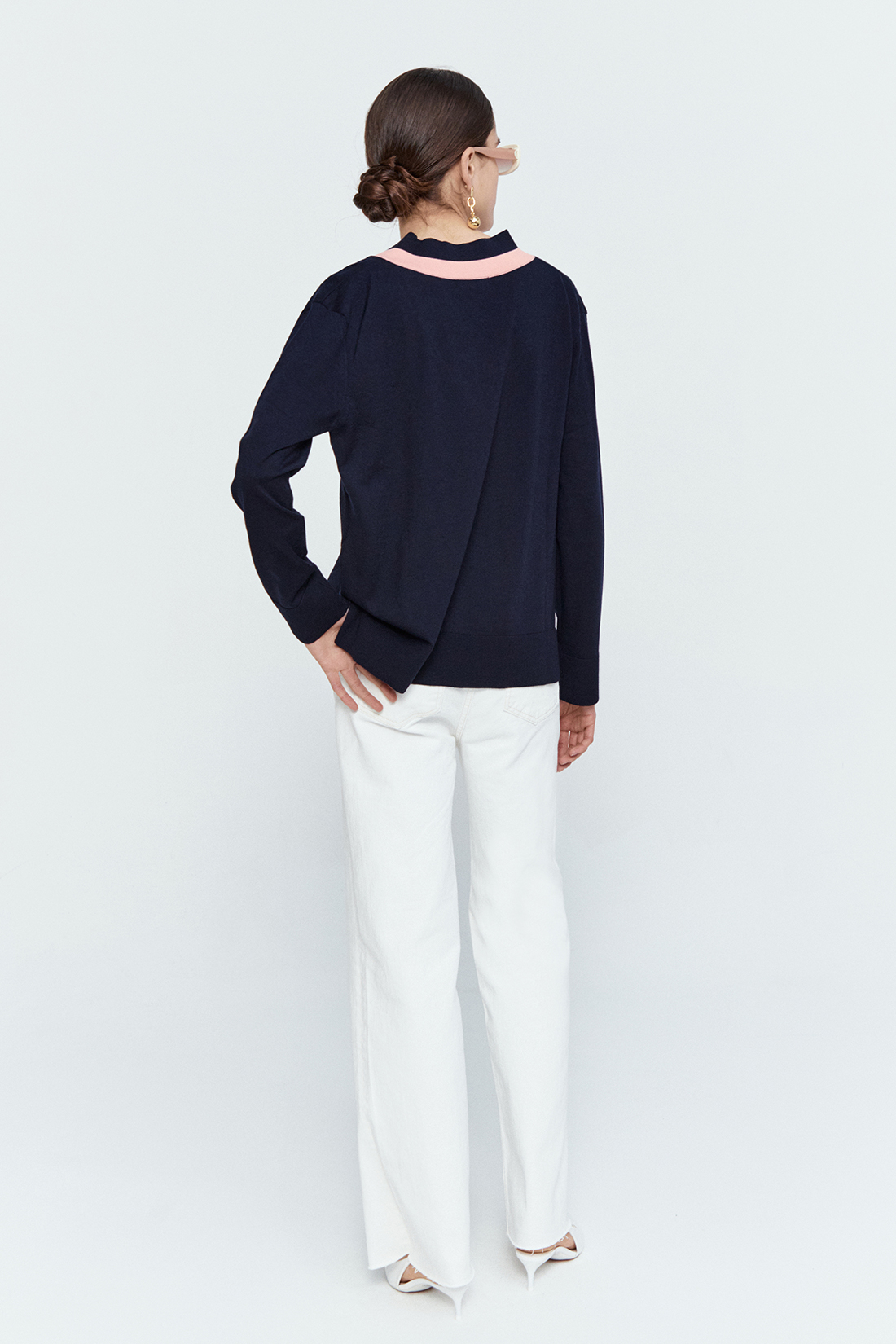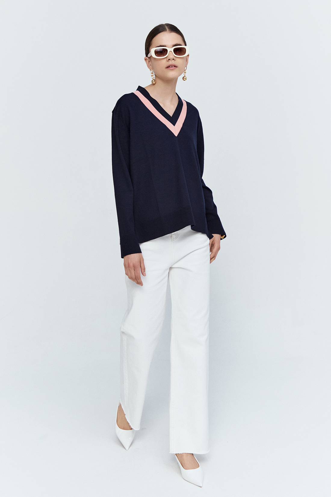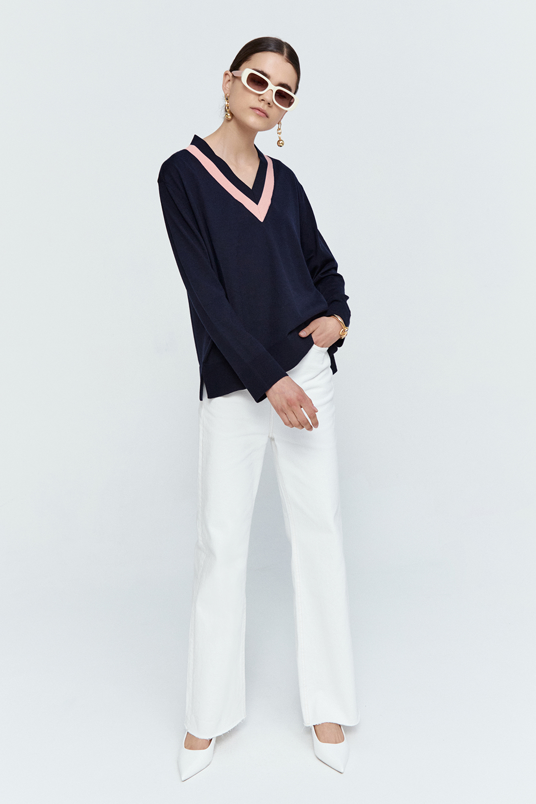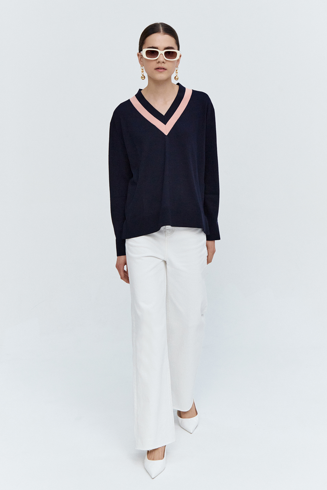 캐쥬얼 무드의 배색 라인 V넥 디자인이 포인트로
